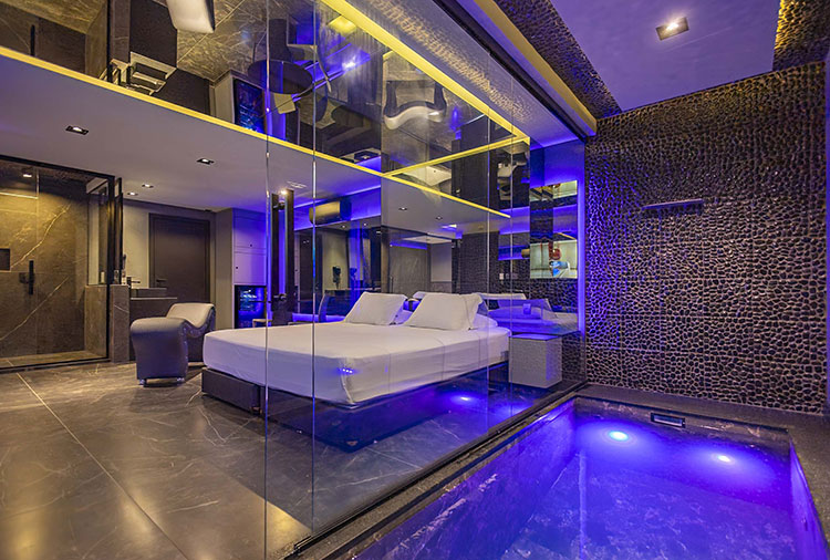 ar-condicionado split, blu-ray com entrada usb, cadeira erótica, cama queen size, canal erótico, ducha dupla, frigobar, futon, garagem privativa, hidro, iluminação por leds, internet Wi-Fi, iPod Dock, lareira, saleta para refeições, sauna úmida, secador de cabelo, som fm, TV LED 32'', TV LED 50"